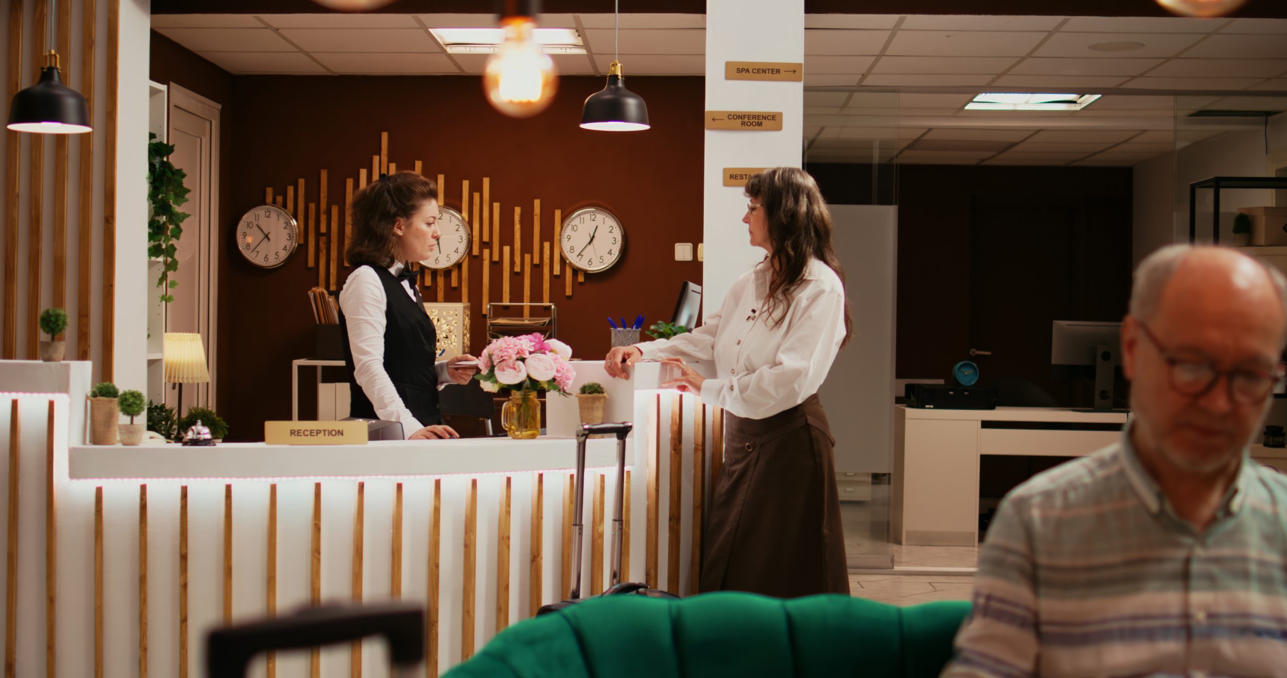 Retired adult taking room key card from reception after doing check in procedure, preparing to start vacation. African american bellboy helping woman with luggage from hotel lobby. Handheld shot.